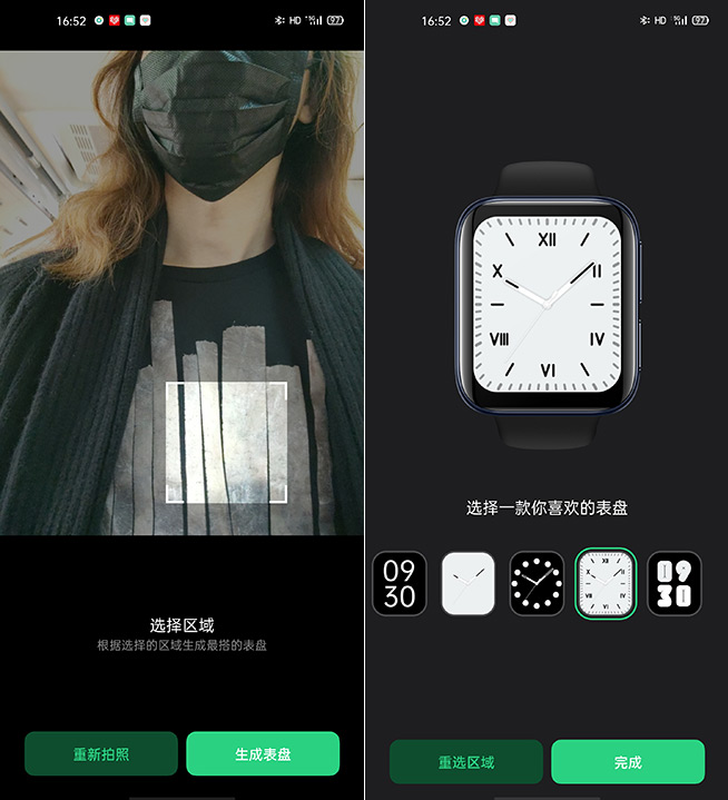 接下來(lái)還要強(qiáng)烈推薦的是穿搭表盤,本人認(rèn)為此乃OPPO Watch表盤玩法的大招。安卓用戶在安裝Heytap健康(OPPO ColorOS 7.1手機(jī)對(duì)應(yīng)自帶的健康A(chǔ)pp)并連接手表之后,選擇表盤管理-穿搭,按照提示進(jìn)行自拍后自行選取區(qū)域,AI人工智能算法將結(jié)合色彩、圖案等元素,自動(dòng)生成多組個(gè)性表盤。