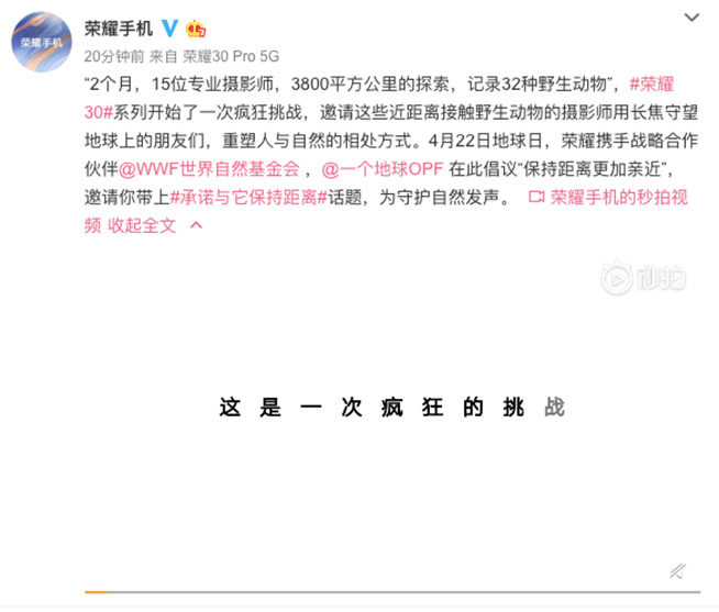 4月22日,榮耀宣布與世界自然基金會(WWF),一個地球自然基金會(OPF)共同發(fā)起「保持距離更加親近」的合作倡議,并聯(lián)合野性中國攝影師共同打造了一支由榮耀30系列拍攝的“國內(nèi)首支手機拍攝野生動物短片”,以此呼吁人與自然和諧共生、守護野生動植物的自然棲息,用影像表達喜愛,用長焦紀錄地球生物多樣性。