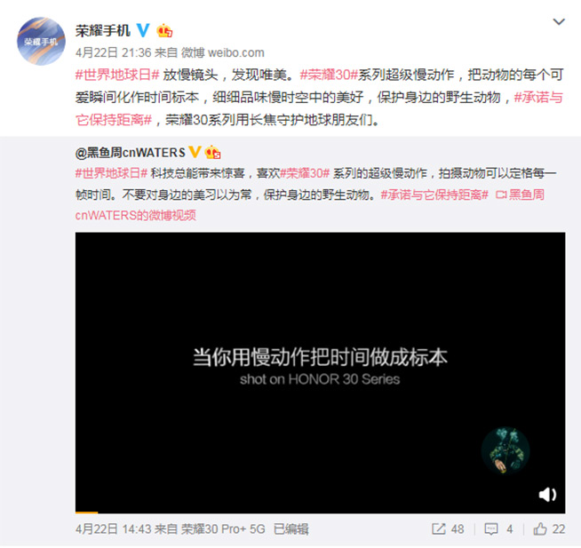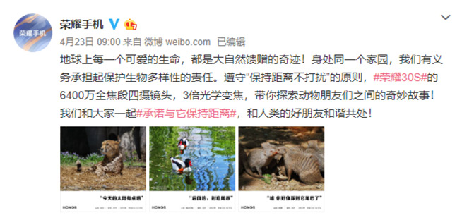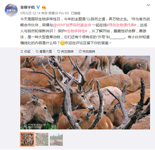 5月21日,榮耀30系列參與到WWF(世界自然基金會(huì))于微博發(fā)起的#尋找生物課代表#的征集活動(dòng)。隨后的5月22日,榮耀和WWF官微分別發(fā)布了一組榮耀30系列拍攝的野生動(dòng)物高清照片,并配上一段珍稀動(dòng)物的科普故事。