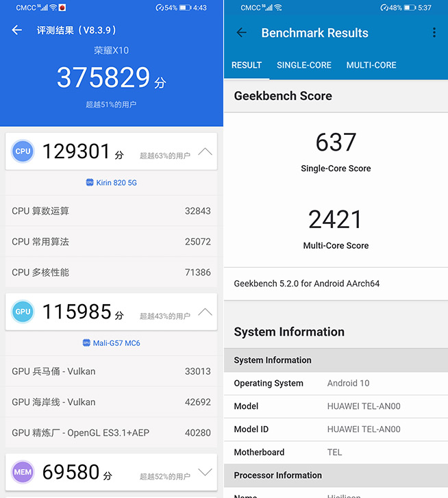 安兔兔的評測顯示,榮耀X10拿到了37.58萬分,而GeekBench 5的結(jié)果為單核637分,多核2421分。