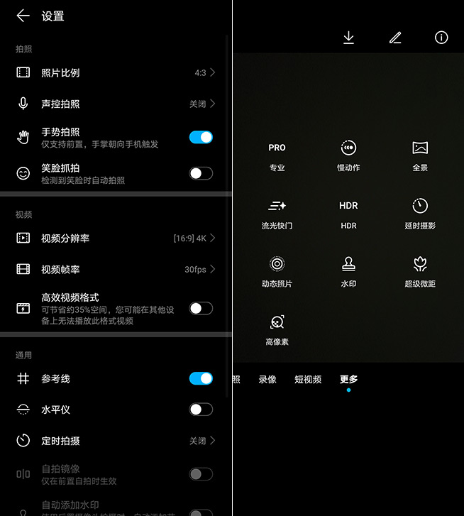 其它攝影功能,包括專業(yè)模式、流光快門、延時攝影等,可以在更多菜單中找到,錄像模式下,榮耀X10支持多達10倍的數(shù)字變焦,此外也能實現(xiàn)4K視頻拍攝、960幀慢動作攝影。