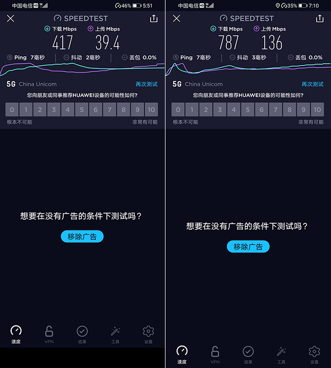 除此之外,榮耀X10還擁有全場景天線設(shè)計,支持超級上行和疾速下載等領(lǐng)先5G技術(shù)。評測人員使用不限速的中國電信5G套餐卡在廣州進行測試,辦公室內(nèi)多次測試都能有超過400Mbps的下行速率,而在戶外的數(shù)次測速中,榮耀X10的下行速率接近800Mbps,上行則高達136Mbps,實戰(zhàn)證實其的確擁有給力的5G上下行速度。