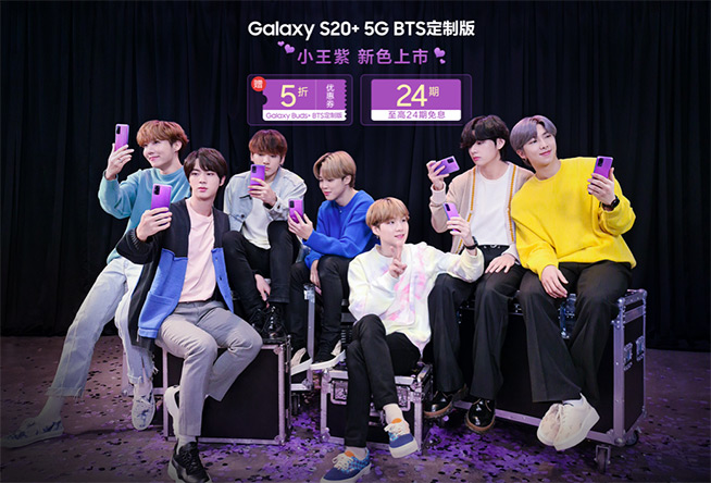 三星Galaxy S20+ 5G BTS定制版為三星攜手全球流行樂壇偶像團(tuán)體防彈少年團(tuán)(BTS),限量打造的特別版,附贈(zèng)具備收藏價(jià)值的BTS團(tuán)員寫真卡。三星Galaxy S20+ 5G BTS定制版背部玻璃背板專門采用BTS應(yīng)援色紫色,此外包括手機(jī)機(jī)身、Galaxy Buds+ BTS定制版耳機(jī)(需另行購買)和充電盒上,也有BTS專屬LOGO和紫色心形標(biāo)志。目前,購買三星Galaxy S20+ 5G BTS定制版(8399元)的消費(fèi)者可享至高24期免息,同時(shí)還可獲得5折購買Galaxy Buds+ BTS定制版(原價(jià)1599元)的專屬優(yōu)惠。