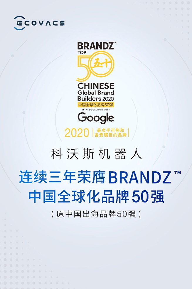 7月16日,Google谷歌聯(lián)合全球最大傳播集團WPP和凱度集團發(fā)布了2020 “BrandZ中國全球化品牌50強”榜單(原“BrandZ中國出海品牌50強”),科沃斯機器人作為唯一的家用服務機器人品牌連續(xù)三年上榜。