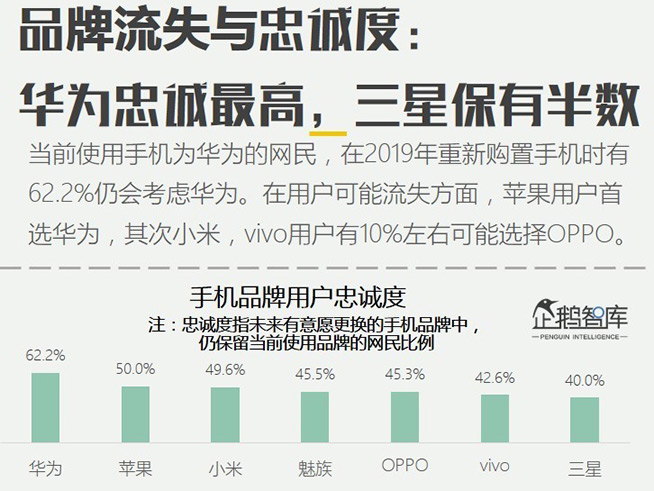根據(jù)企鵝智庫(kù)《智能手機(jī)&智能硬件:2019中國(guó)網(wǎng)民購(gòu)買力報(bào)告》,網(wǎng)友購(gòu)買手機(jī)品牌傾向排名華為領(lǐng)跑,在允許網(wǎng)民選擇至多三個(gè)品牌的前提下,華為取得了超過(guò)八成以上的網(wǎng)民選擇,遠(yuǎn)超競(jìng)品。而在品牌忠誠(chéng)度方面,62.2%的華為手機(jī)用戶重新購(gòu)置手機(jī)時(shí)仍會(huì)考慮華為,同樣排名第一。