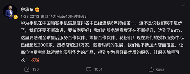 2月22日,伴隨著華為Mate X2折疊旗艦的發(fā)布,新春后的手機(jī)新品潮拉開序幕。在此次發(fā)布會(huì)期間,常務(wù)董事、華為消費(fèi)者業(yè)務(wù)CEO余承東公布了多組華為終端令人振奮的好成績(jī),其中華為手機(jī)連續(xù)六年獲得中國(guó)顧客滿意度第一,服務(wù)滿意度高達(dá)99%。