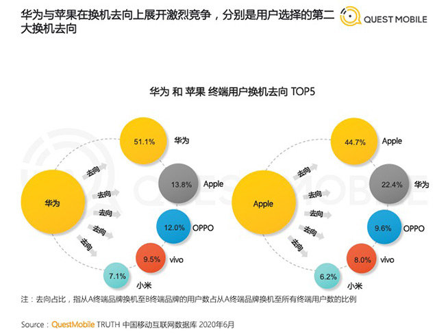 另?yè)?jù)QuestMobile《2020中國(guó)智能終端市場(chǎng)半年洞察報(bào)告》的調(diào)研,“華為與蘋果在換機(jī)去向上展開激烈激增,分別是用戶選擇的第二大換機(jī)去向”,有多達(dá)51.1%的華為終端用戶在換機(jī)時(shí)依然會(huì)選擇華為,蘋果用戶則有44.7%會(huì)繼續(xù)支持蘋果。