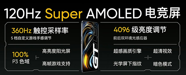 realme真我GT選用的是三星120Hz Super AMOLED競速屏幕,配備前后雙環(huán)境光感應(yīng)器,支持4096級亮度調(diào)節(jié)。當然,新一代光學(xué)屏下指紋也沒有缺席。