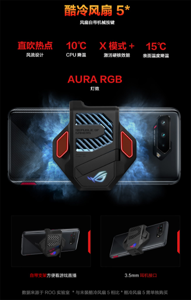 16+512GB的騰訊 ROG游戲手機(jī)5 Pro和18+512GB 騰訊ROG游戲手機(jī)5幻影,則在手機(jī)背面獨(dú)家設(shè)計(jì)了雙腰鍵,鍵位更多,六指戰(zhàn)神戰(zhàn)力更燃,Pro和幻影版本隨機(jī)標(biāo)配酷冷風(fēng)扇5,加持風(fēng)扇按鍵,最多可達(dá)到8指操作。同時(shí),幻影還是全球首款配置真18GB運(yùn)行內(nèi)存的手機(jī),非虛擬18GB內(nèi)存可比,是手機(jī)性能的又一次里程碑式升級(jí)。