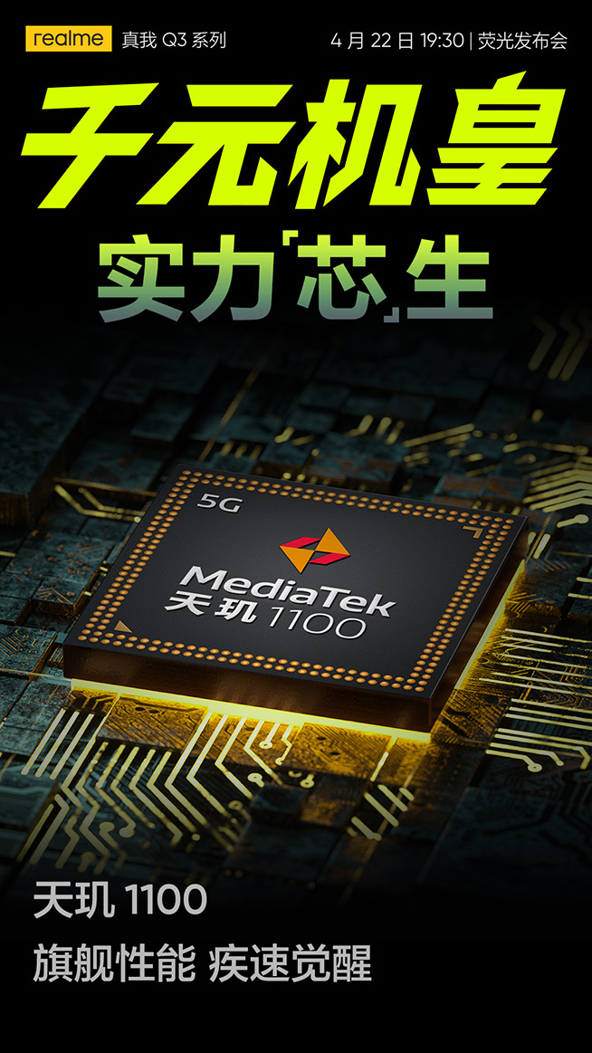 根據(jù)realme副總裁、中國區(qū)總裁徐起的介紹,真我Q系列手機(jī)有兩個(gè)重要使命:“設(shè)計(jì)上,彰顯年輕人的潮流個(gè)性;性能上,享受越級科技帶來的樂趣”。令人眼前一亮的螢火蟲手機(jī),如上所述從設(shè)計(jì)層面果然有驚喜。性能部分,即將登場的真我Q3系列,這次將攜天璣1100 5G旗艦芯而來,為千元機(jī)注入關(guān)鍵的超越表現(xiàn),要知道先前天璣1100芯片僅用在3000元檔的機(jī)型中。
