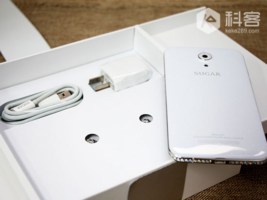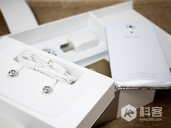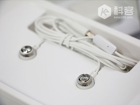 掀開裝載手機(jī)的間層,在包裝的底部,我們可以看有隨機(jī)附送的數(shù)據(jù)線和充電器,還有BlingBling的“鉆石”入耳式耳機(jī)。所有附送的配件均以純白色為外觀的顏色,甚為簡約。