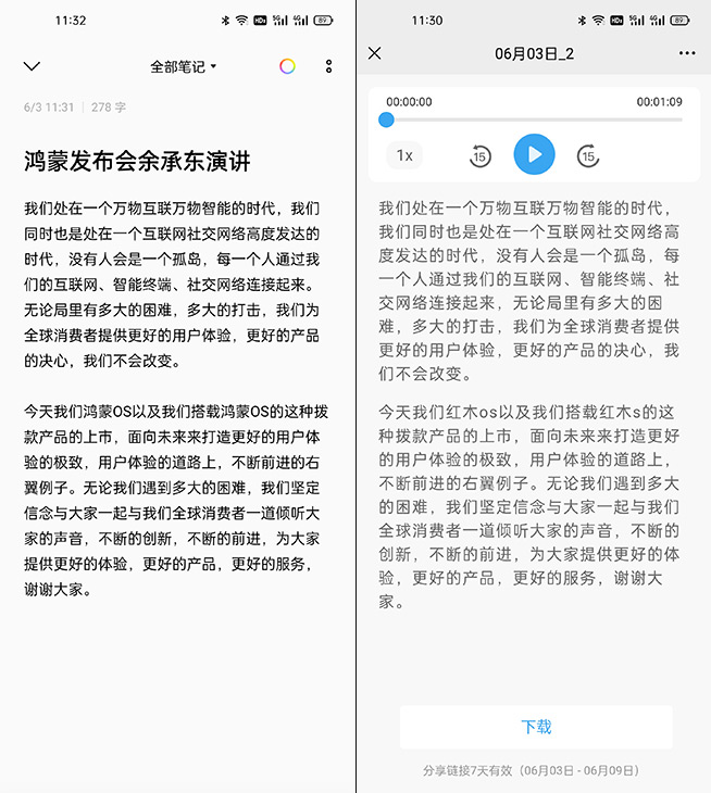首先選擇6月2日華為消費者業(yè)務(wù)CEO余承東在鴻蒙OS發(fā)布會上的一段演講視頻,通過手機揚聲器外放(音量60%左右),訊飛智能錄音筆SR302選擇“標準錄音”,在離手機大約0.5米的位置進行錄音。對比演講文稿與錄音筆轉(zhuǎn)錄的文字(見下面截圖),除了“鴻蒙OS”這種比較新的專業(yè)術(shù)語識別有誤之外,其余文字無一出錯,看來官方給出的高達98%準確率果然靠譜。