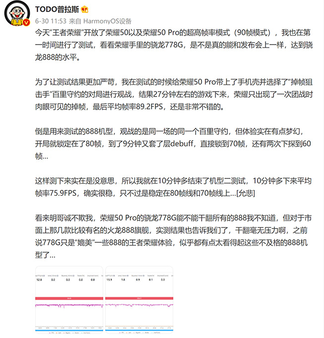 至于榮耀50 Pro的表現(xiàn),根據(jù)微博達人“TODO普拉斯”的測試,該機在27分鐘左右的王者榮耀對局觀戰(zhàn)中平均幀率為89.2FPS,而使用驍龍888機型觀戰(zhàn)同一場10分鐘平均幀率僅有75.9FPS。很明顯,搭載驍龍778G的榮耀50 Pro在相同場景下的幀率及穩(wěn)定度成績,相比驍龍888手機勝出一大截,此次對比還表明,光有驍龍888不等于游戲體驗好,優(yōu)化不到位的話,驍龍888機型也會拉跨,甚至被降維打擊。