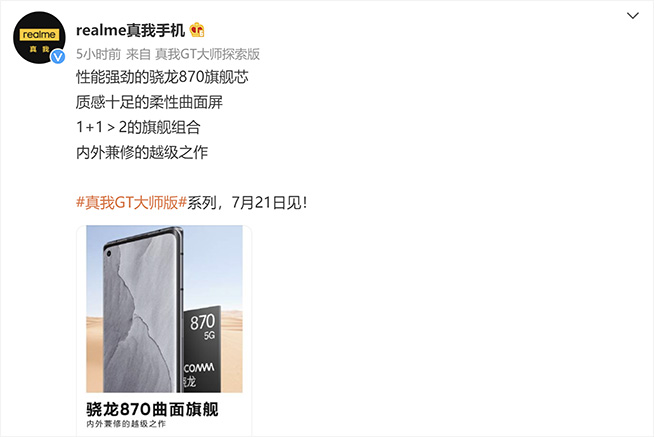 自本周realme真我官方宣布7月21日將發(fā)布真我GT大師系列新機(jī)以來(lái),真我GT大師系列連日來(lái)的關(guān)注度迅速攀升。7月16日,真我GT大師系列關(guān)鍵的性能與屏幕參數(shù)逐漸出爐,其中真我GT大師探索版確認(rèn)會(huì)是realme首款搭載驍龍870移動(dòng)平臺(tái)的曲面旗艦。