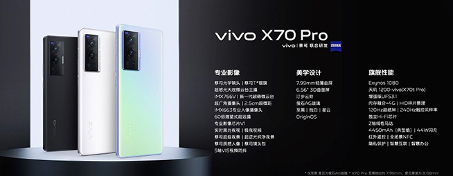 輕薄,是vivo X70和X70 Pro在做好影像功能的同時,希望繼續(xù)帶給用戶的優(yōu)秀操控體驗,前者為2.5D直屏,后者則是3D曲面屏。兩款機型分別重181g和185g,電池容量相應為4400mAh和4450mAh,厚度均不超過8mm。X70和X70 Pro都有三款配色,黑色版后蓋升級為螢石AG工藝,手感出色。其它重點方面,X70以及X70t Pro選用了聯(lián)發(fā)科天璣1200 vivo版芯片,X70t與X70 Pro則搭載三星Exynos 1080芯片,兩款機型均采用44W有線閃充。