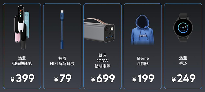 在發(fā)布會上, 199 元的魅藍 Blus 主動降噪耳機、79 元的魅藍 HiFi 解碼耳放、399 元的魅藍掃描翻譯筆、699 元的魅藍 200W 儲能電源、199 元的 lifeme 連帽衫、249 元的魅藍手環(huán)一并亮相,一脈相承的設計感與品質(zhì)感,讓魅藍青年良品依舊成為了不少用戶所熱愛的精品。