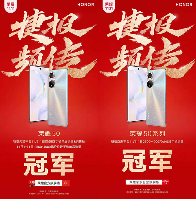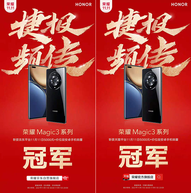 由榮耀雙11戰(zhàn)報(bào)可知,榮耀Magic3系列手機(jī)在11月11日當(dāng)天,在天貓和京東雙平臺均拿到了5000+價(jià)位段安卓手機(jī)銷量冠軍。另外自推出以來持續(xù)熱銷的榮耀50系列手機(jī),11月11日當(dāng)天也豪奪天貓與京東雙平臺2500-4000元價(jià)位段的銷量冠軍,且在天貓11月1-11日榮耀50系列還是該價(jià)位段手機(jī)的單品銷量累計(jì)冠軍。
