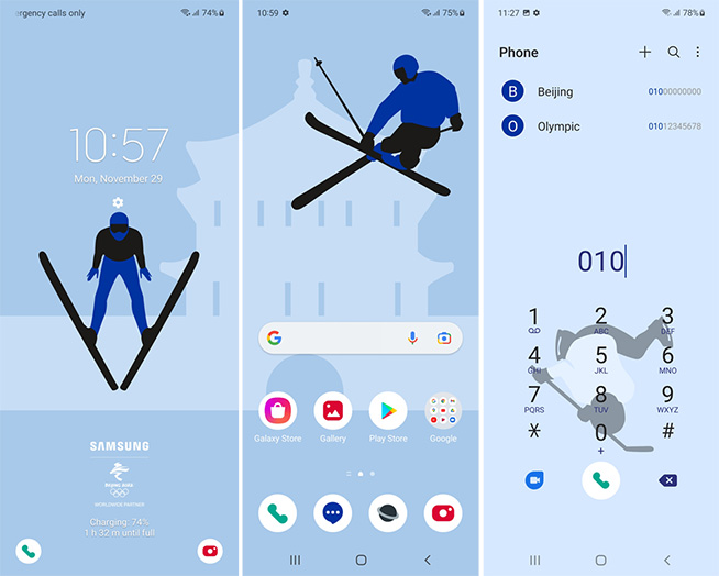 值得注意的是,三星Galaxy Z Flip3 5G 奧運(yùn)紀(jì)念版手機(jī)的內(nèi)部UI也進(jìn)行了冬奧專屬設(shè)計(jì),從主題界面、息屏提醒到開關(guān)機(jī)畫面皆重新繪制。手機(jī)主題和壁紙界面均以藍(lán)色為底色,背景與圖標(biāo)遵循簡約而不簡單的設(shè)計(jì)原則,界面元素不僅包含滑雪這一冬奧大熱賽事,還巧妙地將北京標(biāo)志性建筑天壇輪廓以冰雪色嵌入背景中,既穩(wěn)重大氣,又不失活力。