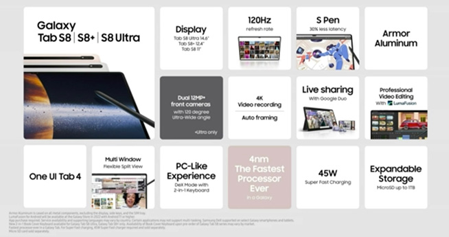 與三星Galaxy S22系列新機同步發(fā)布的還有三星Galaxy Tab S8系列平板,同樣是中杯、大杯、超大杯的組合。Galaxy Tab S8 Ultra擁有14.6英寸超大Super AMOLED屏、1200萬像素前置雙攝、可選16GB內(nèi)存等更豪華的規(guī)格。