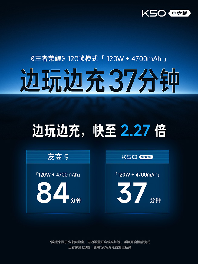相比上代機型,K50電競版將有線快充拉滿,不僅加強至120W,只需17分鐘就能把4700mAh電池充至100%,還擁有超越120W競品一大截的邊玩邊充速度。根據(jù)官方測試數(shù)據(jù),邊玩王者榮耀邊充電,K50電競版只需37分鐘充滿,友商iQOO 9則需要84分鐘。