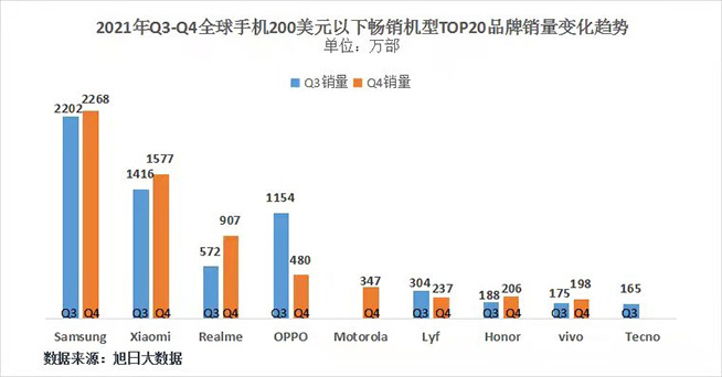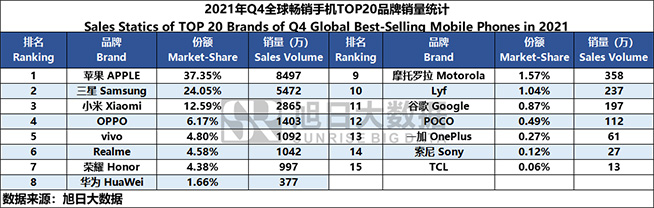 2021年Q4全球暢銷手機(jī)TOP20品牌銷量統(tǒng)計(jì)與Q3不同的是,傳音此次沒有上榜,TCL、索尼再次入圍。