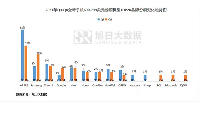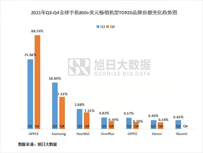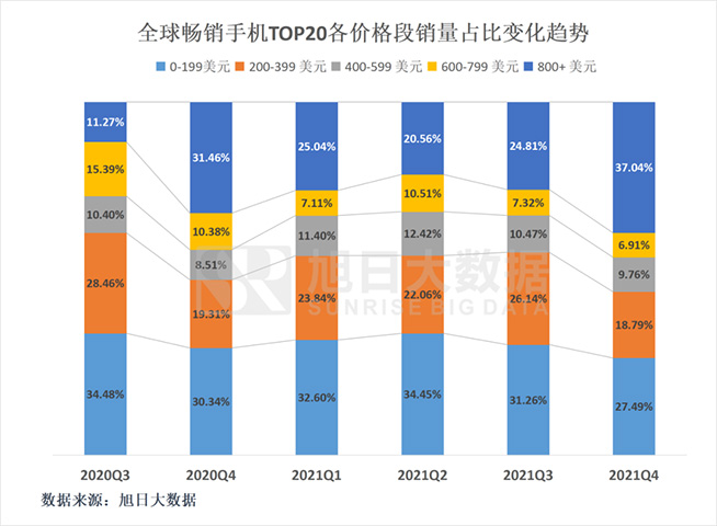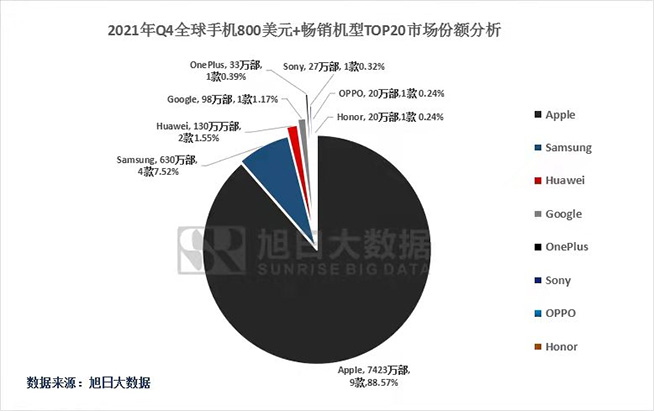 Q4是蘋果iPhone 13新品熱銷的傳統(tǒng)季度,但在800美元+暢銷機(jī)型TOP20市場(chǎng)份額高達(dá)近9成,還是達(dá)到了歷史新高。