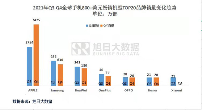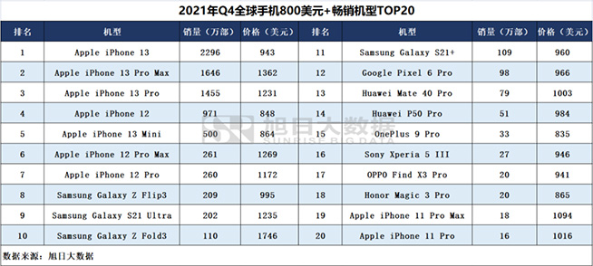 3、2021年Q4全球手機(jī)800美元+暢銷機(jī)型TOP20:蘋果創(chuàng)新高