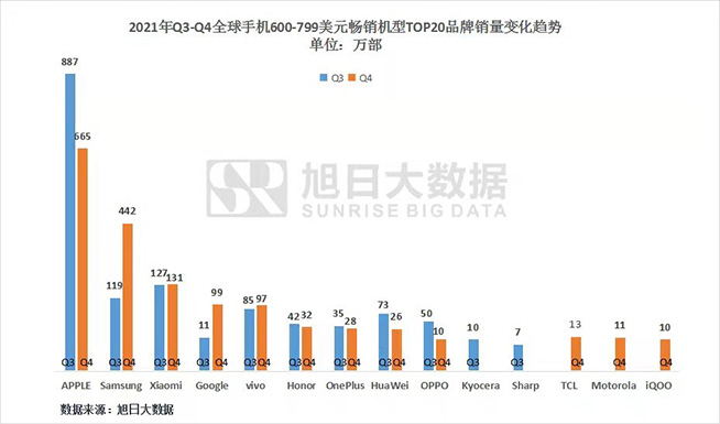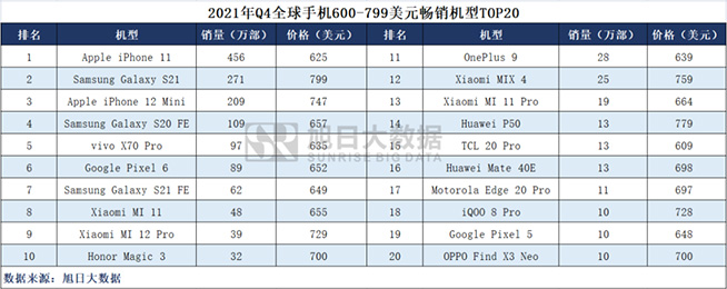 4、2021年Q4全球手機(jī)600-799美元暢銷機(jī)型TOP20:小米領(lǐng)跑中國(guó)品牌