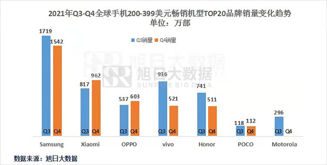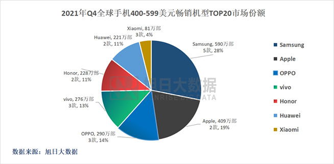 2、2021年Q4各價(jià)格段全球暢銷手機(jī)TOP20:小米穩(wěn)居第三