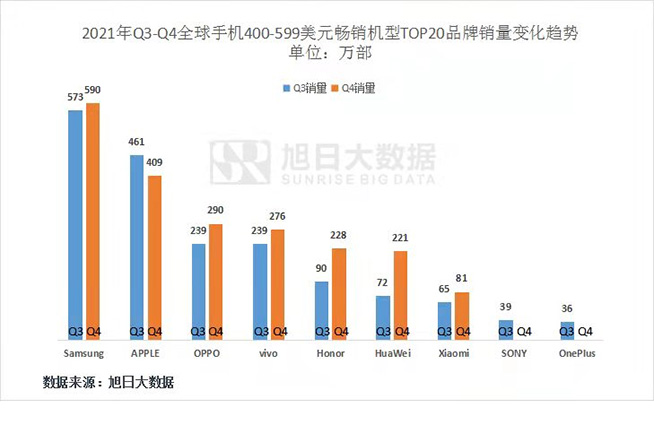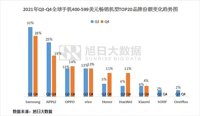 潮電智庫(kù)統(tǒng)計(jì)Q4季度400-599美元的暢銷機(jī)型發(fā)現(xiàn),蘋果、榮耀、華為各占2款,OPPO、vivo、小米等各占3款,三星占5款。