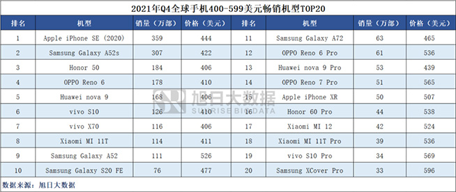 5、2021年Q4全球手機(jī)400-599美元暢銷機(jī)型TOP20:OV領(lǐng)銜