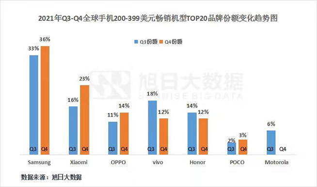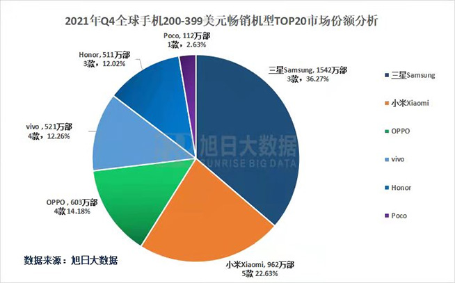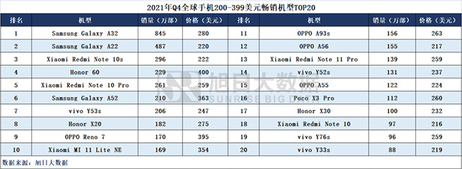 6、2021年Q4全球手機(jī)200-399美元暢銷機(jī)型TOP20:Redmi發(fā)威