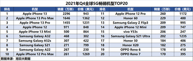 1、2021年Q4全球暢銷手機(jī)TOP20:高端市場(chǎng)份額飚升