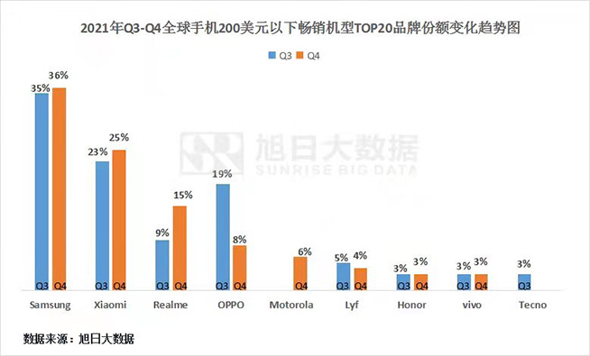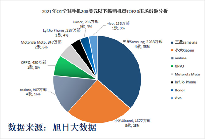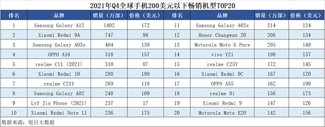 7、2021年Q4全球手機(jī)200美元以下暢銷機(jī)型TOP20,增速冠軍Realme