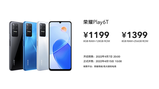 榮耀Play6T提供幻夜黑、魅海藍(lán)、鈦空銀三種配色,榮耀Play6T 8+128GB版本售價(jià)1199元,8+256GB版本售價(jià)1399元,于4月7日20:00開(kāi)啟預(yù)售,4月15日10:08正式開(kāi)售!歡迎大家前往榮耀商城及各大授權(quán)電商平臺(tái)了解購(gòu)買(mǎi)今天的兩款新品!
