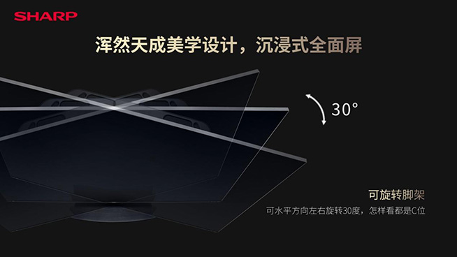 底座采用了方型正中的設(shè)計(jì),靈感來源于國(guó)人的“中庸之道”,待人接物不偏不倚、折中調(diào)和,很是考究,也折射出夏普獨(dú)特的理解。并且,該設(shè)計(jì)還可以實(shí)現(xiàn)水平方向左右30°的旋轉(zhuǎn),不僅便于背部接口拔插,也能讓觀影角度更靈活,處處是C位。