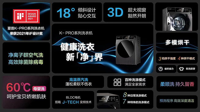 擁有65年悠久歷史的夏普洗衣機(jī),也在發(fā)布會(huì)上正式發(fā)布了夏普K-PRO系列,該系列洗衣機(jī)在2021年榮獲了iF設(shè)計(jì)大獎(jiǎng)。其外觀精致美觀,并擁有上百種洗滌模式的組合,使用便捷,省心又省力。