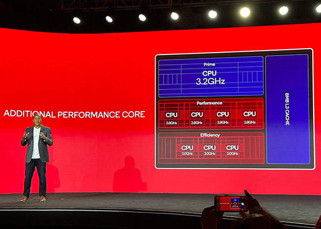 第二代驍龍8的CPU采用1+4+3架構(gòu),超大核Cortex X3最高主頻仍然為3.2GHz,四個(gè)性能大核為主頻最高達(dá)2.8GHz,包含了2個(gè)Cortex-A715和2個(gè)Cortex A710,這個(gè)特殊的設(shè)計(jì)也可以視為是1+2+2+3架構(gòu)。至于3個(gè)能效小核,為2.0GHz的Cortex A510。官方數(shù)據(jù)稱,第二代驍龍8相比上一代驍龍8,CPU性能提升達(dá)35%,CPU能效提升40%。