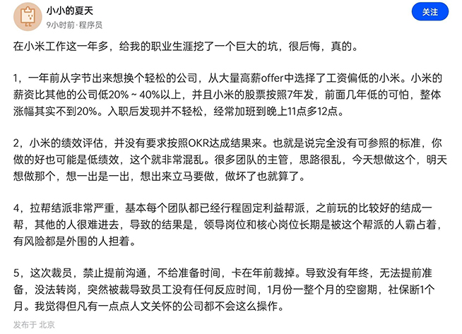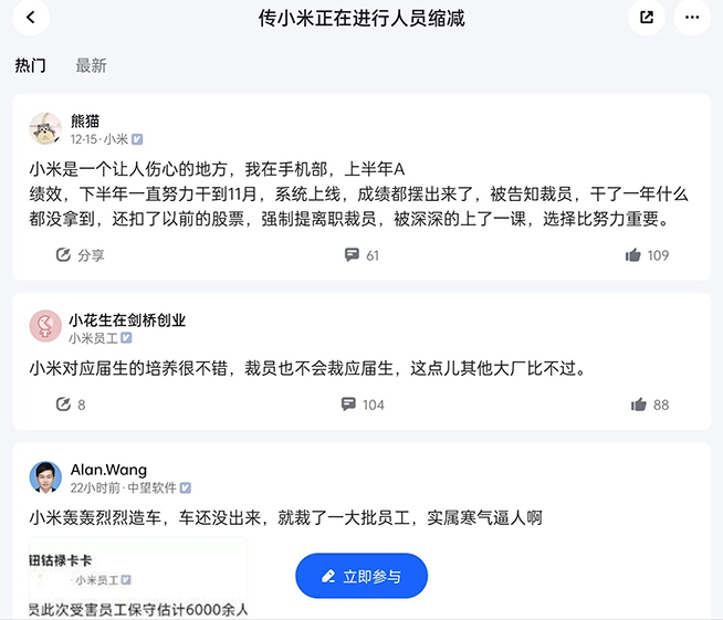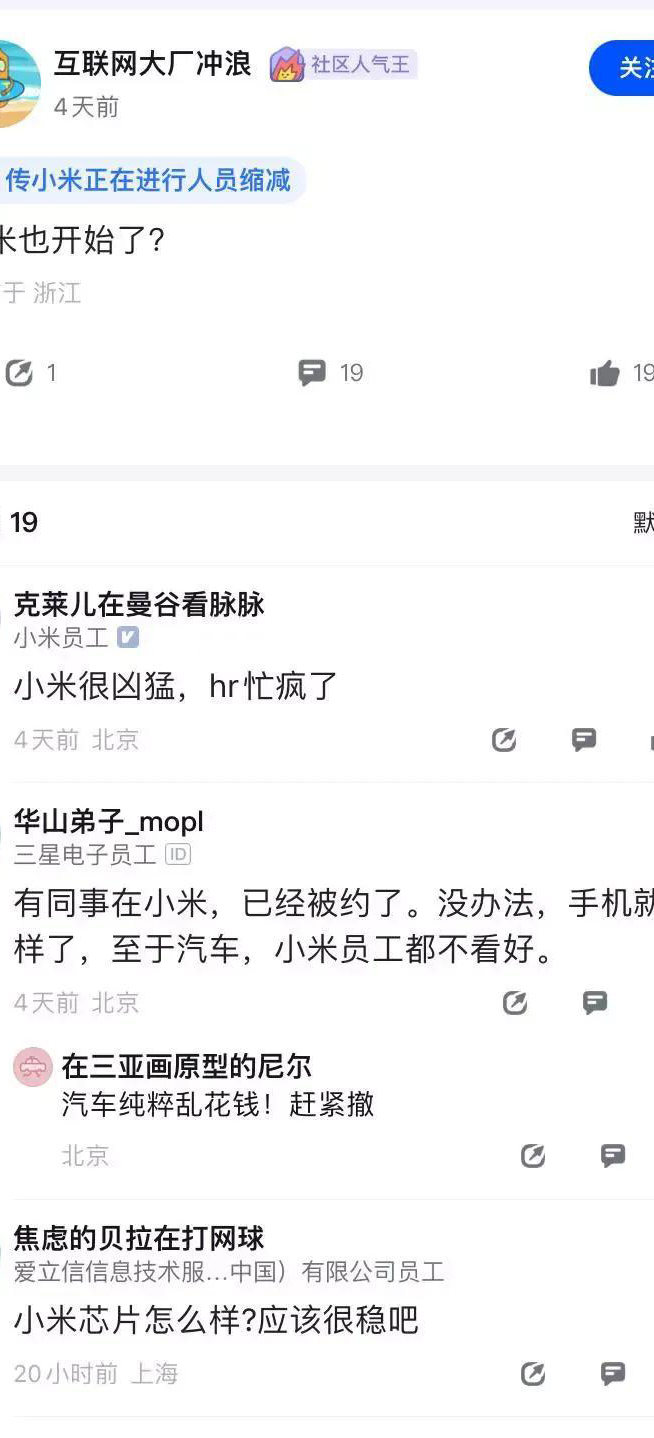 看了一下相關(guān)的消息,有部分員工稱小米裁員卸磨殺驢,有人即便績效拿到A也被開刀。另外不少人普遍不看好小米造車,稱小米是被外界高位捧殺,雷軍崇尚順勢而為,于是All in汽車。但車還沒造出來就裁了一大批員工,實(shí)屬寒氣逼人!
