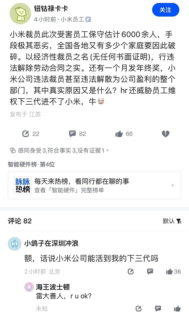 年關(guān)將至,你在的單位裁員了嗎?近日在社交軟件上小米裁員的消息討論熱烈,有不少小米員工和前員工開啟爆料模式,有人稱小米計(jì)劃在年前裁員6000人左右,但補(bǔ)償金額不盡如人意,“hr忙瘋了”。