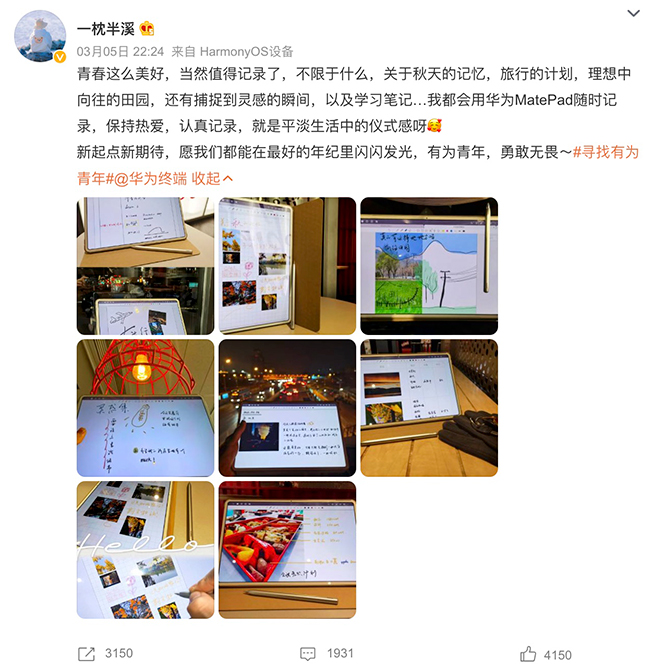 由官方數(shù)據(jù)可知,#尋找有為青年#話題閱讀次數(shù)達到9.3億,討論次數(shù)11.8萬,原創(chuàng)人數(shù)超過3000。據(jù)悉,此次活動有許多高質(zhì)量的作品是用華為平板進行創(chuàng)作的,部分參賽者還在社交平臺分享了使用相關(guān)華為設(shè)備的創(chuàng)作心得。