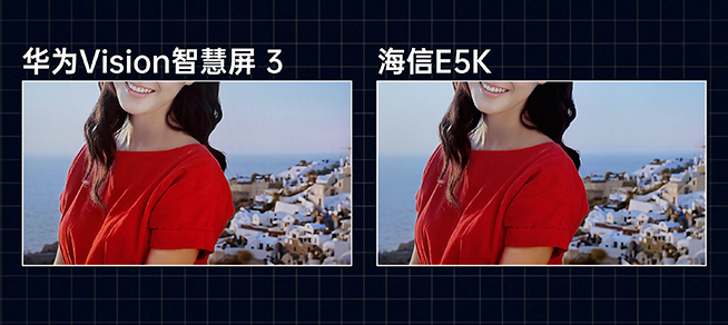 接下來是重中之重的畫質(zhì),兩款產(chǎn)品都是主流的直下式背光,海信作為傳統(tǒng)大廠,雖然顯示水準(zhǔn)是值得信賴的,在多個經(jīng)典場景樣片的演示對比中可發(fā)現(xiàn),二者顯示白天場景亮度差異不大,但華為Vision智慧屏 3的表現(xiàn)更加立體,放大后的畫面細(xì)節(jié)清晰度更勝一籌;而夜間場景海信E5K雖然亮度占優(yōu),但是動態(tài)高光壓制不及華為Vision智慧屏 3給力;在色彩還原方面,華為Vision智慧屏 3風(fēng)格更接近真實(shí)的顏色,表現(xiàn)力飽滿,海信E5K顏色的呈現(xiàn)略有泛綠。