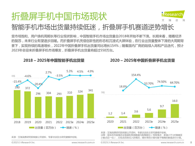 秒變大屏、高端大氣有個性,折疊屏手機正在被越來越多的消費者所接受。2019年才商用的折疊屏手機,短短兩年即迎來爆發(fā)元年,2022年中國市場折疊屏手機出貨量達到360萬臺,同比增速超過150%。預計在今年,中國市場的折疊屏手機還將取得超過50%的高速成長,全年出貨量有望超過550萬臺。