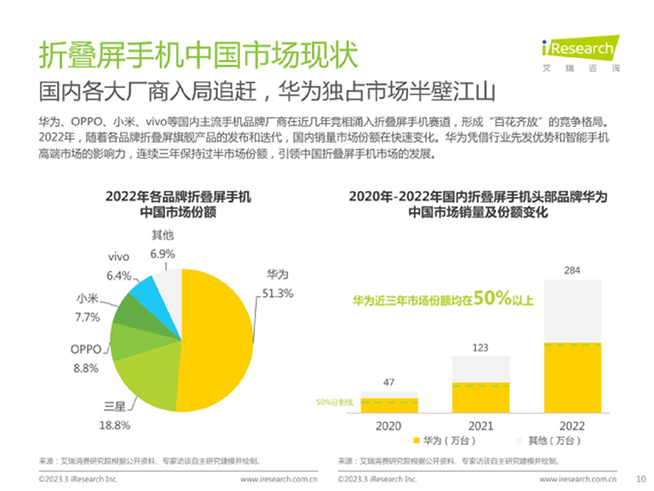 時至今日,除了蘋果之外,主流的手機品牌均已推出折疊屏機型,消費者可供選擇的產(chǎn)品日漸豐富,市場競爭越發(fā)白熱化。群雄逐鹿的新賽道,誰是領(lǐng)頭羊呢?哪個品牌的產(chǎn)品更值得信賴呢?根據(jù)艾瑞咨詢2023年中國折疊屏手機市場洞察報告,中國折疊屏手機市場,華為已經(jīng)連續(xù)三年保持過半市場份額,持續(xù)引領(lǐng)行業(yè)的發(fā)展,并且華為在用戶認知和滿意度排名最高。