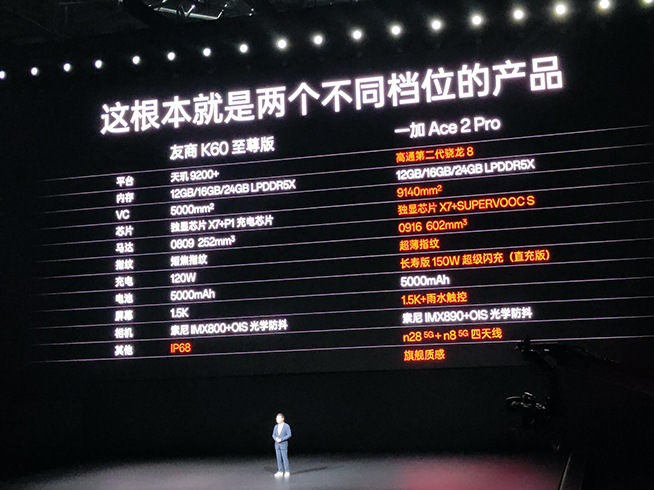 李杰指出,一加Ace 2 Pro堅持產(chǎn)品力優(yōu)先的原則,所以選擇了性能更好、能效更優(yōu),但也更貴的第二代驍龍8芯片。相比友商選擇的處理器A,即Redmi K60至尊版選擇的天璣9200+,一加要多花2億元。