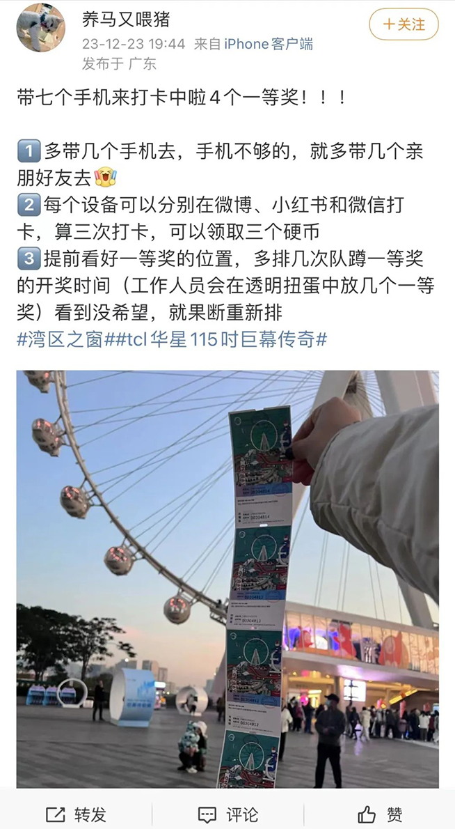 更值得一提的是,參與者帶相關話題拍攝照片或視頻發(fā)布至社交平臺、分享觀展心情和感受,還可參與現(xiàn)場扭蛋摩天輪門票抽獎,即刻感受亞洲第一摩天輪的超級魅力,這吸引了一大波現(xiàn)場游客駐足參與,成為歡樂港灣人氣最足的打卡地。在活動現(xiàn)場,更是爆出有位幸運參與者自帶7部手機打卡TCL華星115吋巨幕傳奇展,各種分享打卡姿勢,甚至做好了自制打卡抽獎超級攻略,并且抽中了4個一等獎摩天輪門票,著實讓人羨慕。?