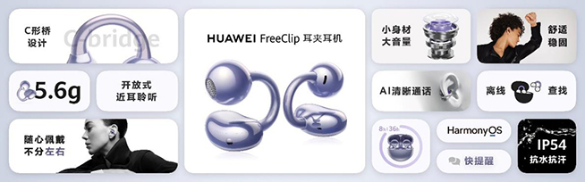 華為FreeClip耳夾耳機(jī),以創(chuàng)新球面設(shè)計(jì)踐行極簡(jiǎn)美學(xué)理念。流光紫和星空黑兩款配色,滿足用戶的時(shí)尚穿搭需求。開放形態(tài)不入耳,“C形橋”設(shè)計(jì)(C-bridge Design),內(nèi)置鎳鈦記憶合金,可靠耐用。整機(jī)形態(tài)依據(jù)人因工程學(xué)原理設(shè)計(jì),自然貼合耳廓,單只耳機(jī)僅重5.6g,實(shí)現(xiàn)舒適無負(fù)擔(dān)的佩戴體驗(yàn)。配合10.8mm雙磁高靈敏度單元,帶來不入耳道亦悅耳的聽音體驗(yàn)。搭載逆聲場(chǎng)聲學(xué)技術(shù),減小漏音。單耳機(jī)充滿8小時(shí)持續(xù)音樂播放,搭配充電盒36小時(shí)整機(jī)音樂播放續(xù)航,并支持多設(shè)備連接、音頻共享等智慧體驗(yàn)。同時(shí)提供了HUAWEI Care+服務(wù),與新機(jī)搭配購買,給耳機(jī)更貼心的守護(hù)。華為FreeClip耳夾耳機(jī)定價(jià)1299元,將于2023年12月26日開啟預(yù)售,2024年1月12日全渠道正式開售,用戶可登陸華為商城及各大授權(quán)電商平臺(tái)或前往華為體驗(yàn)店、華為授權(quán)零售門店進(jìn)行購買。