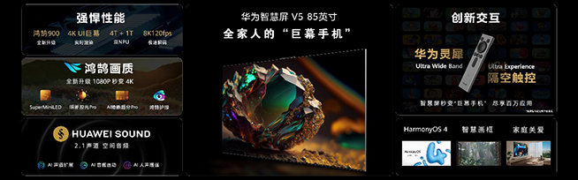 華為發(fā)布全新智慧屏 V5,其保持著智慧屏品類一貫的優(yōu)勢(shì)。智慧功能上,持續(xù)搭載華為靈犀指向遙控,帶來“像玩手機(jī)一樣玩電視”的全新交互體驗(yàn);配合超級(jí)桌面功能,把海量手機(jī)應(yīng)用搬上大屏,解鎖“巨幕手機(jī)”的百種新玩法。畫質(zhì)上,SuperMiniLED鴻鵠畫質(zhì)支持“1080P秒變4K”,呈現(xiàn)出更細(xì)膩、清晰的畫面細(xì)節(jié)。娛樂體驗(yàn)上,搭載HarmonyOS 4,通過多設(shè)備協(xié)同方式及多樣化客廳娛樂玩法,打造專屬全家人的85英寸巨幕影院。華為智慧屏 V5 85英寸將于2023年12月26日開啟全渠道預(yù)售,并于2023年12月30日正式開售,售價(jià)17999元。屆時(shí)用戶可登錄華為商城及各大授權(quán)電商平臺(tái)或前往華為體驗(yàn)店、華為授權(quán)零售門店進(jìn)行選購。
