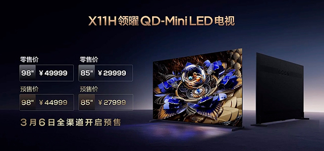 TCL X11H共有85吋和98吋兩款尺寸,首發(fā)驚喜價分別為27999元和44999元,目前已經(jīng)在全渠道開啟預(yù)售。