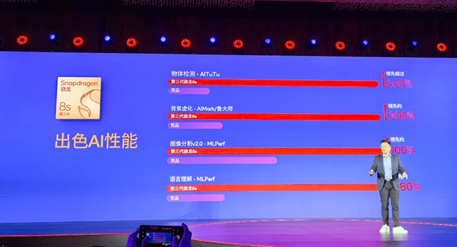 另外,第三代驍龍8s的AI能力出眾,高通強調(diào)其AI性能比競品顯著領(lǐng)先,且能夠支持高達100億參數(shù)的大模型。以物體檢測場景AITuTu為例,第三代驍龍8s領(lǐng)先競品超過300%。